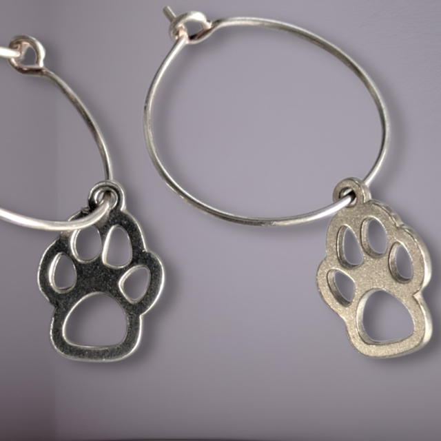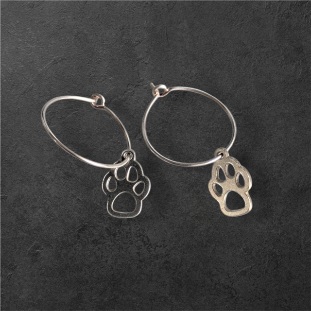 Laser cut and finished in a UK jewellery workshop, these sterling silver 12mm paws (0.8mm depth) with a central loop are placed on sterling silver 20mm wire hoops.